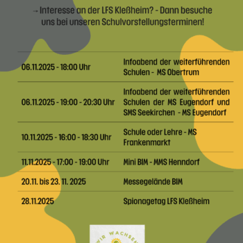 Wo ihr uns treffen könnt? Das zeigt euch das Bild!Wir sind bei verschiedenen Schulvorstellungen in der Umgebung dabei und freuen uns, wenn ihr vorbeischaut, euch informiert und mit uns ins Gespräch kommt. Und wer noch mehr erleben möchte, kommt einfach zu unserem Spionagetag: Ein Nachmittag voller Einblicke, Mitmachaktionen und Praxis – direkt bei uns an…